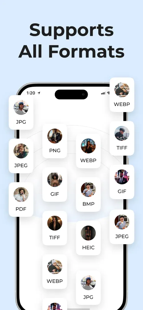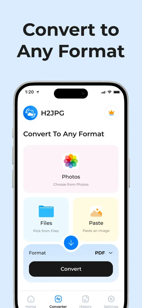 All-in-One Image Converter: From JPG, JPEG, PDF, PNG, HEIC, TIFF, WEBP, GIF to BMP — H2JPG handles them all, making it your go-to app for image conversion.