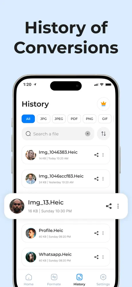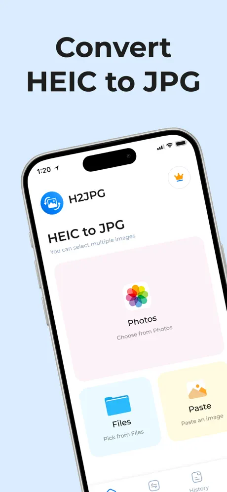 HEIC → JPG: Quickly convert your iPhone HEIC photos into the widely supported JPG format with just a tap.